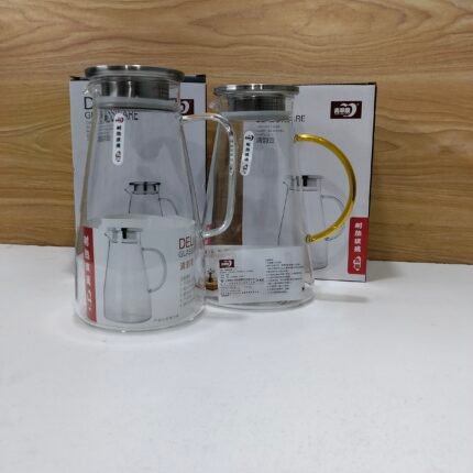 Further Than Glass Borosilicate Water Jug with steel Lid Material: Borosilicate Glassware Jug Color: Transparent Capacity: 1.9 Liter Hight: 9 inch Type: juice Jug Hit resistant Oven prof Deli Brand Origin: Made in China